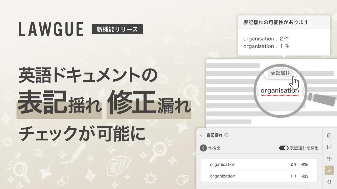 AIを搭載したクラウド ドキュメント ワークスペース「LAWGUE」を提供するFRAIM株式会社(本社:東京都渋谷区、代表取締役社長:宮坂豪)は、「LAWGUE」における英文ドキュメントの「表記揺れ」「修正漏れ」チェックが可能になりました。これにより目視による見落としリスクが低減され、よりスピーディな確認作業が実現します。 |
