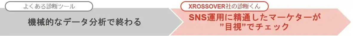 | こうした課題を解決するため、XROSSOVERではSNSマーケティングの専門家がアカウントを分析し、企業がすぐに実行できる改善施策を提示するサービスとして「SNS診断くん」を開発しました。 | |||