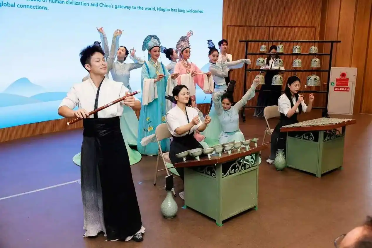 千年にわたる文化の系譜が新たに花開く。寧波デーの文化展示エリアでは、『唐山勝景画稿』上巻「浙東編」のデジタル動態再現、精巧な復元を施された寧波の古船の実物模型、そして優雅で厳粛な『四明仏画』の文創品などが生き生きとした歴史の絵巻を描き出しています。国家級無形文化遺産である「三金一嵌」の職人技の展示と『四明文庫』文創書灯の革新的デザインが調和し、天童寺や保国寺などの仏教文化や建築文化の展示が、伝統文化の創造的転換と革新的発展の現代的実践を示しています。
