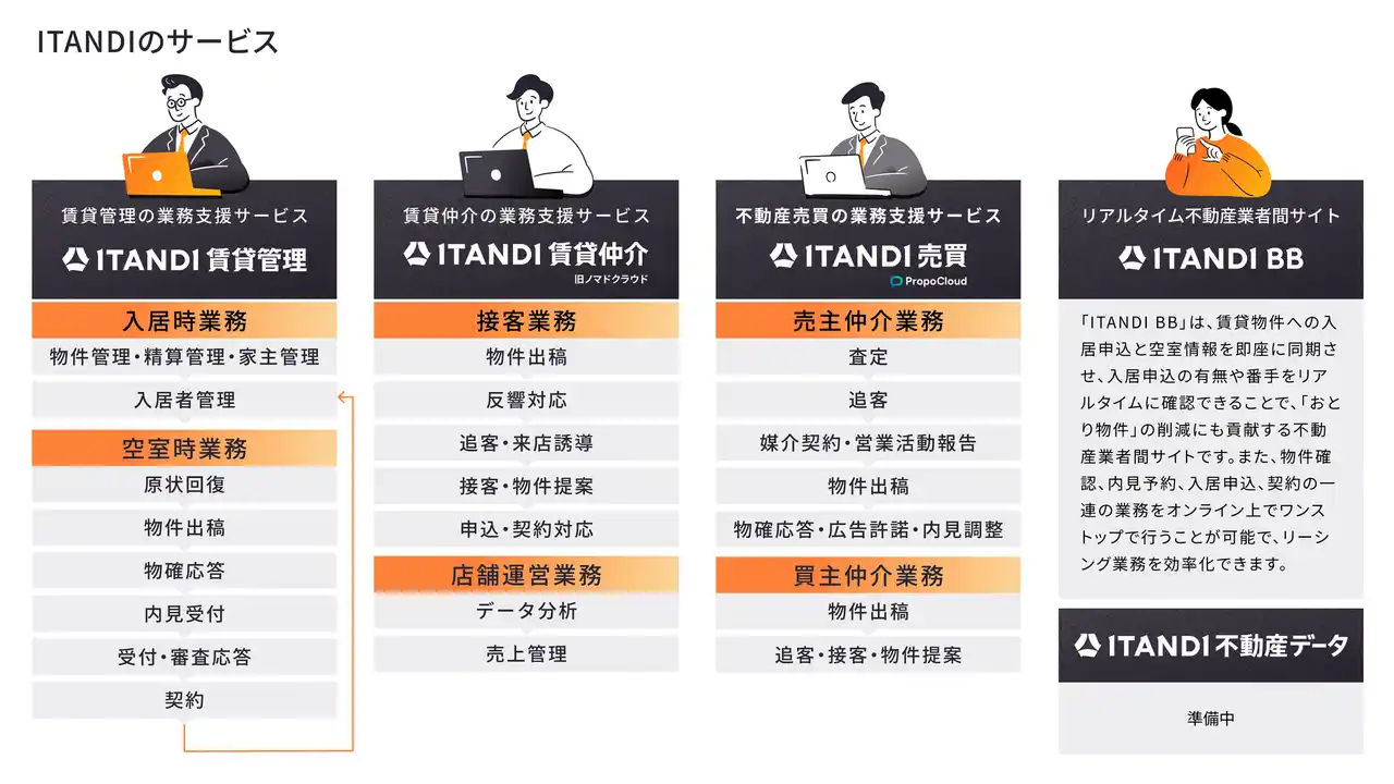 不動産賃貸・売買の取引における一連の業務をDXするサービスを提供しています。不動産賃貸領域ではリアルタイム不動産業者間サイト「ITANDI BB」のほか、「ITANDI BB」と連携する賃貸管理の業務支援サービス「ITANDI 賃貸管理」や、賃貸仲介の営業支援サービス「ITANDI 賃貸仲介(旧「ノマドクラウド」)」を展開。不動産売買領域では不動産売買仲介会社向け営業支援サービス「ITANDI 売買 PropoCloud」を展開し、それぞれの領域でなめらかな業務体験と取引体験を実現しています。 |