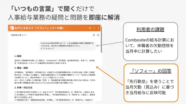 本サービスは、大企業向け人事給与SaaS「Combosite人事給与」に関して、利用者が知りたいことを「いつもの言葉」で入力するだけで、AIが対話形式で必要な回答を提示するAIアシスタントです。AIによる回答の他に、AIアシスタント「ソフィー」への質問内容と回答を要約したうえで、カスタマーサクセスチーム(CS)へ問い合わせできる機能も実装しています。 |