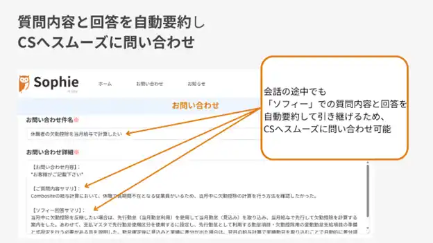 さらに、AIアシスタント「ソフィー」での質問内容と回答の要約は問い合わせページに自動反映されるため、追加で確認したい内容がある場合でも、必要事項をあらためて入力することなく当社CSへ問い合わせることができます。 |