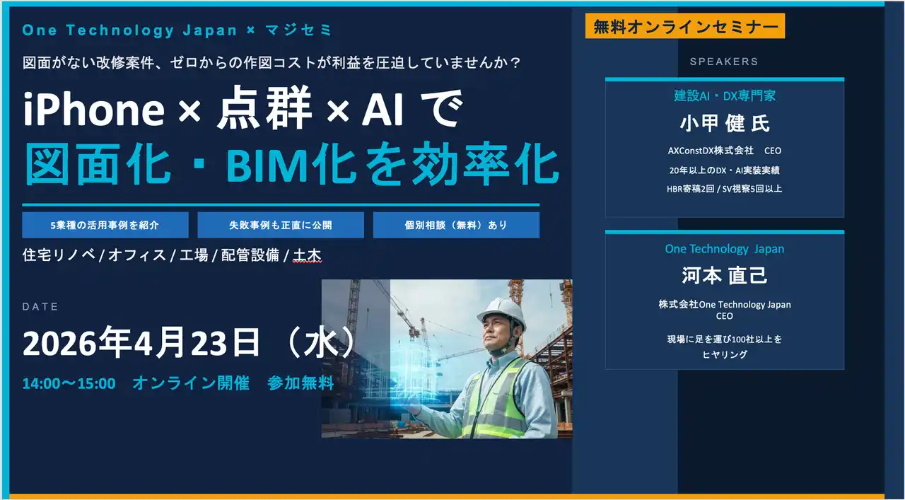 建設・施設管理向けiPhone LiDARアプリ「InsightScanX」「AI Inspector」「HOUSECAN」を開発・提供する株式会社One Technology Japan(本社:神奈川県川崎市、代表取締役:河本 直己、以下「当社」)は、2026年4月23日(水)14:00より、無料オンラインセミナー「図面がない改修案件、ゼロからの作図コストが利益を圧迫していませんか?~iPhone×点群×AIで低コストに図面化・BIM対応を効率化~」を開催します。 |