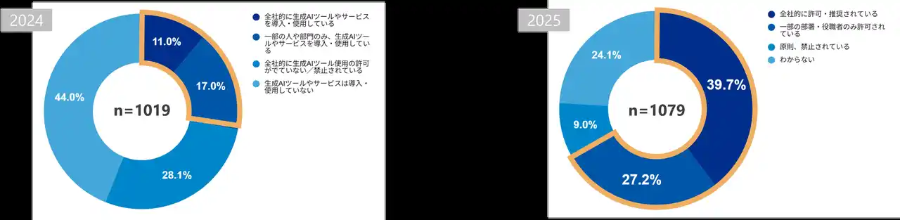 ■「社内で生成AIは導入されていますか?」に対する回答結果( 左図:2024、右図:2025) |