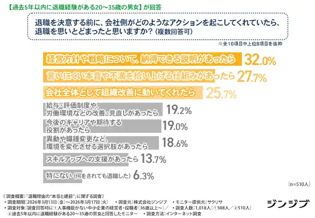 「退職を決意する前に、会社側がどのようなアクションを起こしてくれていたら、退職を思いとどまったと思いますか?」とたずねたところ、『経営方針や戦略について、納得できる説明があったら(32.0%)』が最も多く、『言いにくい本音や不満を拾い上げる仕組みがあったら(27.7%)』『会社全体として組織改善に動いてくれたら(25.7%)』と続きました。また、「特にない(何をされても退職した)(6.3%)」となり、9割以上の方はまた「会社の対応があれば思いとどまった」可能性があったことが読み取れます。 |