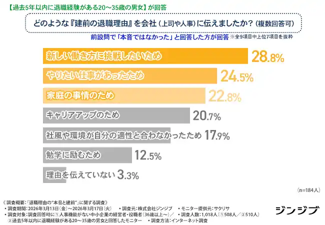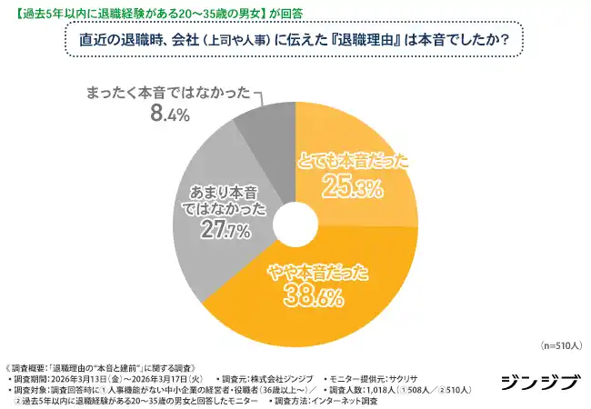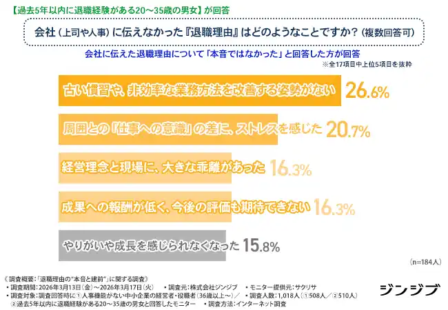 株式会社ジンジブ(本社:大阪市)では、1.人事機能がない中小企業の経営者・役職者/2.過去5年以内に退職経験がある20~35歳の男女を対象に「退職理由の“本音と建前”」に関する調査を行いました。 |