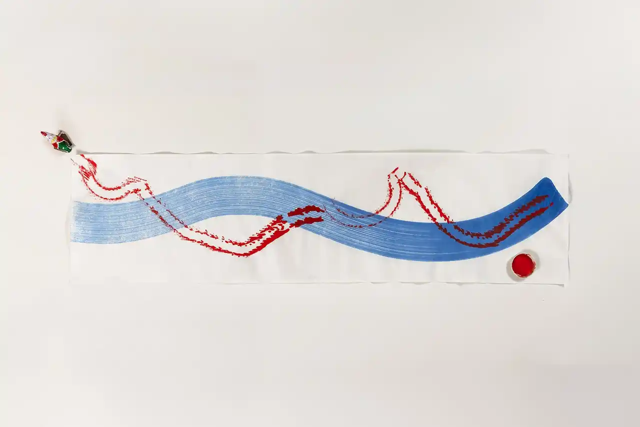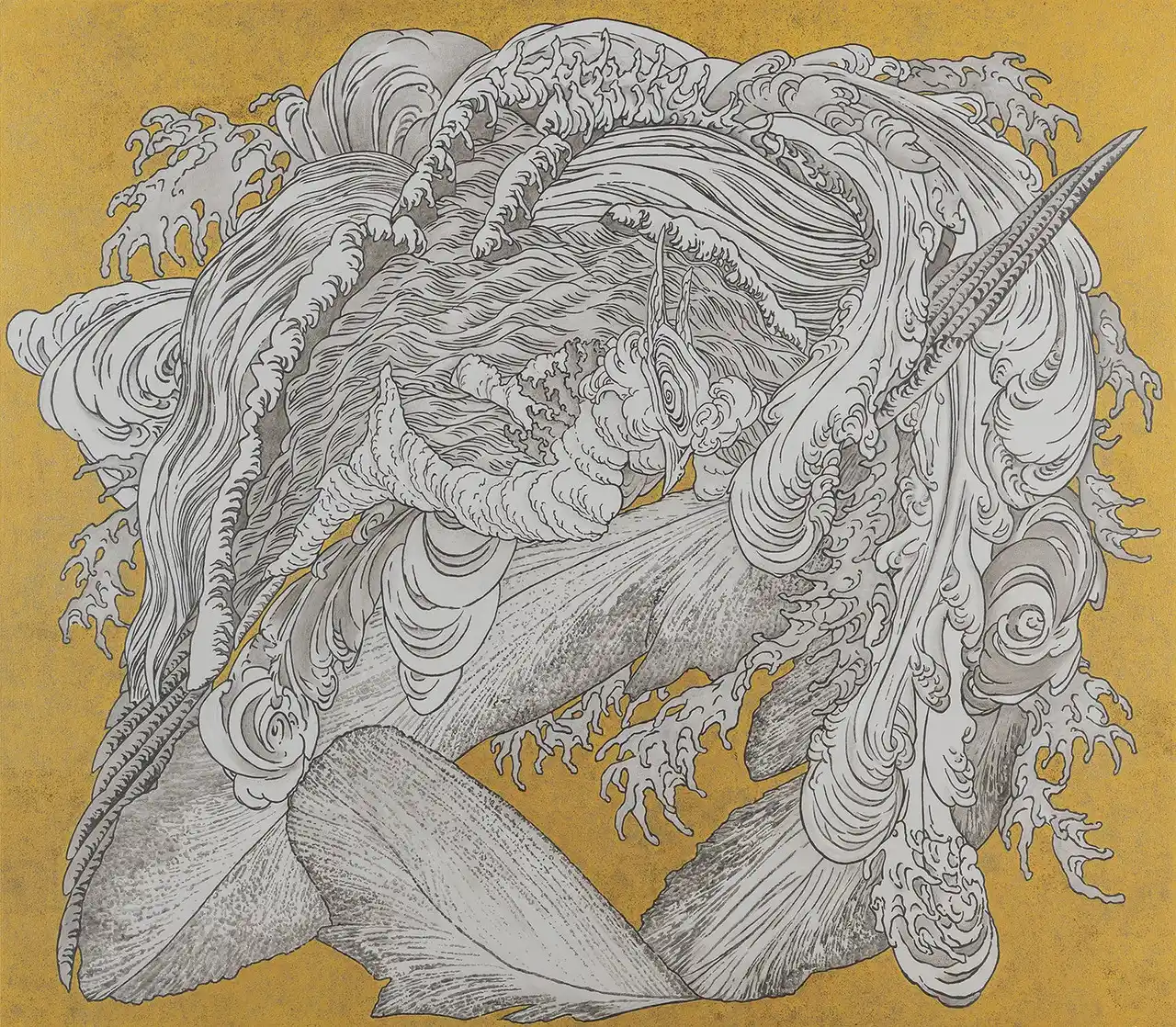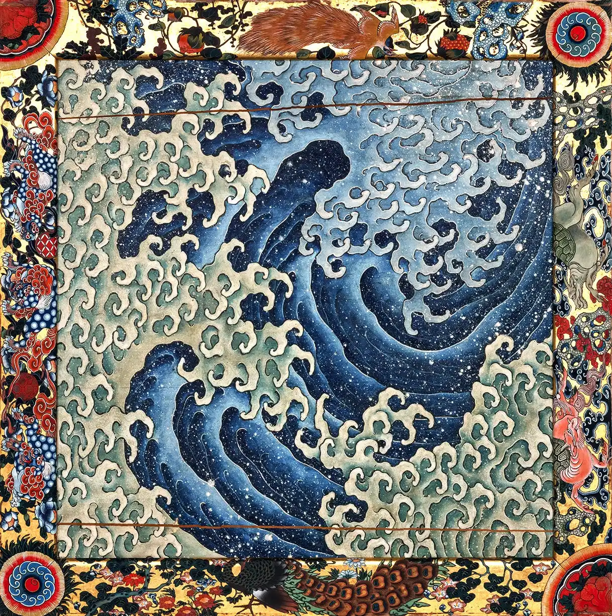「制作当初どの向きで浪図が配置されていたのか判明しない…」(註3)ことも浪を再構成するプロセスを自由にしてくれて、北斎の波に手を加えることなくそのまま引用した。最初から図像の中に暗示されていたかたちから、近年の浪の俗称がついたと思われる。(コメント:福田美蘭) |