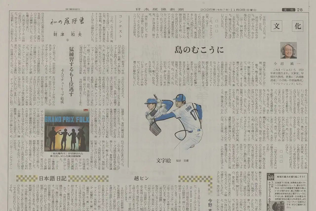 大谷翔平選手は、2025年11月に3年連続のMVPを受賞し、50本塁打&50奪三振という二刀流復活を象徴とするW記録も達成。この挿絵掲載の11月9日の時点でMVP受賞はほぼ確実と予想され、結果待ちの状態だったので、大谷の姿に「うつ」「なげる」の隠し文字を入れ、江戸時代から伝わる文字絵とした。北斎も文字と絵を融合させたユーモアあふれる遊び絵を制作していて、北斎にとって文字は形そのものが絵の骨格となる素材であり、文字を幾何学的パーツの集合体と捉えて読むものから見るものへと昇華させた点に新しさがあるように思う。技術的高さとユーモアが両立した江戸時代の粋を感じさせる魅力に、大谷への期待を重ねた。(コメント:福田美蘭) |