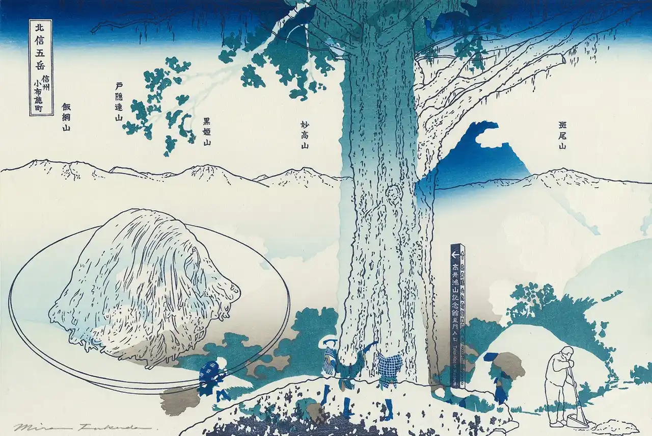 「冨嶽三十六景 甲州三嶌越」の背の高い巨木の存在感は、小布施町中心のシンボルツリーとして大きく枝を拡げ、来訪者を迎えるメタセコイアの印象と重なり、その後方にはこの町の高台から一望できる北信五岳の連なりを描く。富士山と同様に単独峰でありながら、五岳が揃って見える事は素晴らしいのだが、高さでは富士山に負けるので、それより高いモンブランの山として、秋の小布施堂の栗の点心「朱雀」を風景に組み込む。朱雀の美味しい季節には、毎日メタセコイアの大量の落ち葉を掃く人がいて、その人の背後の三角形と朱雀の形は北斎の画面に特有の相似形となった。(コメント:福田美蘭) |
