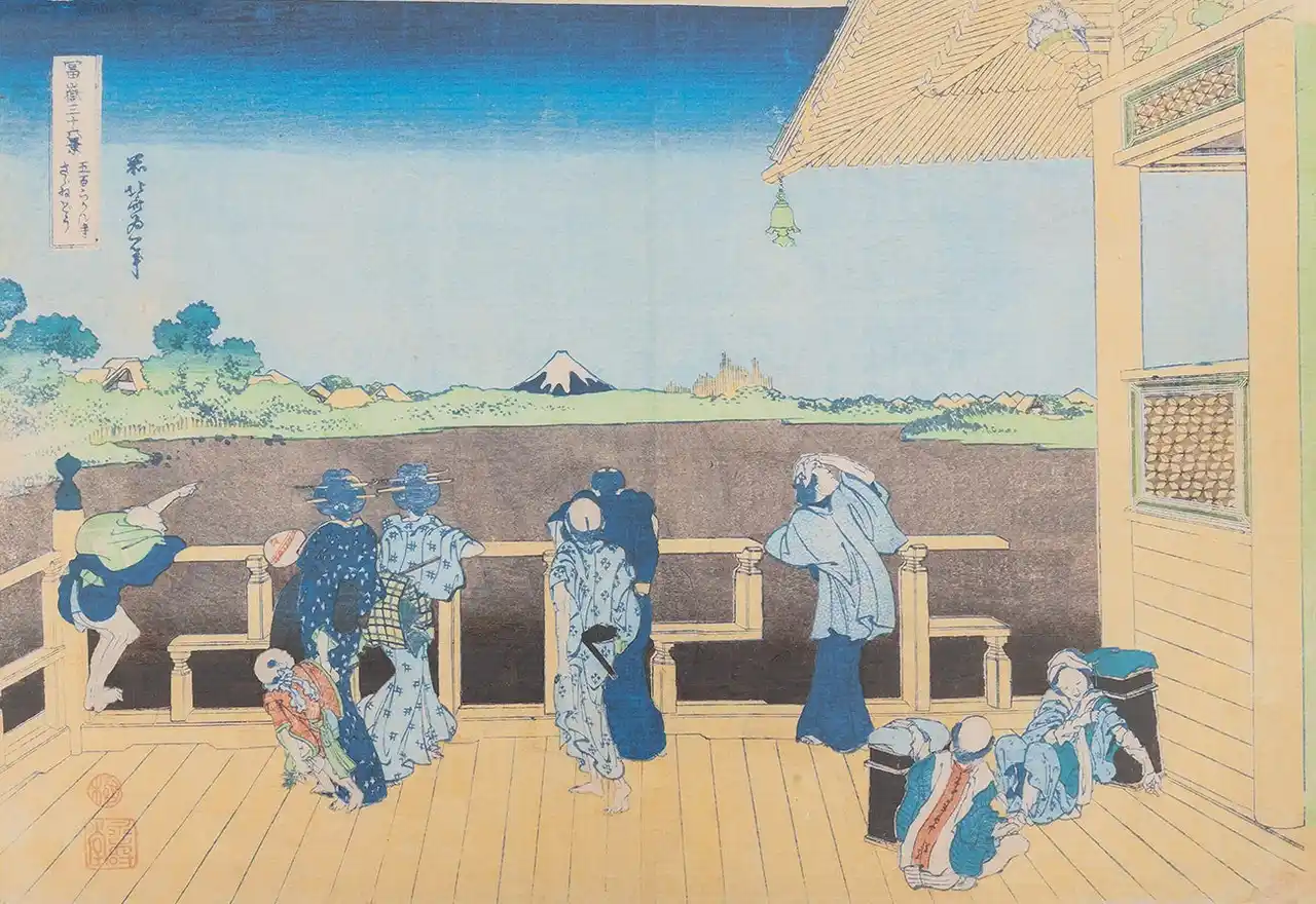 北斎の「冨嶽三十六景 五百らかん寺さざゐ」の構図には、視線を富士山に誘導するいくつもの仕掛けがあり(註1)、欄干はそれらの効果を生かすように画面に安定感を与え、又さざえ堂の上から富士山を眺める人々の日常の空間と、その先に拡がる霊峰富士が象徴する世界の境界として重要な役割を担っていると思うのだが、実際に作品を鑑賞する時には視界は富士山に強く引き込まれ、欄干にとどまることはない。この北斎の見えるということを自在にあやつる作画の工夫を面白いと思ったので、北斎の仕掛けにあやかり、ここでは欄干の中に2026の4つの数字が隠れているとして、人物を動かし数字を現わして2026年の年賀状の絵柄とした。(コメント:福田美蘭) |