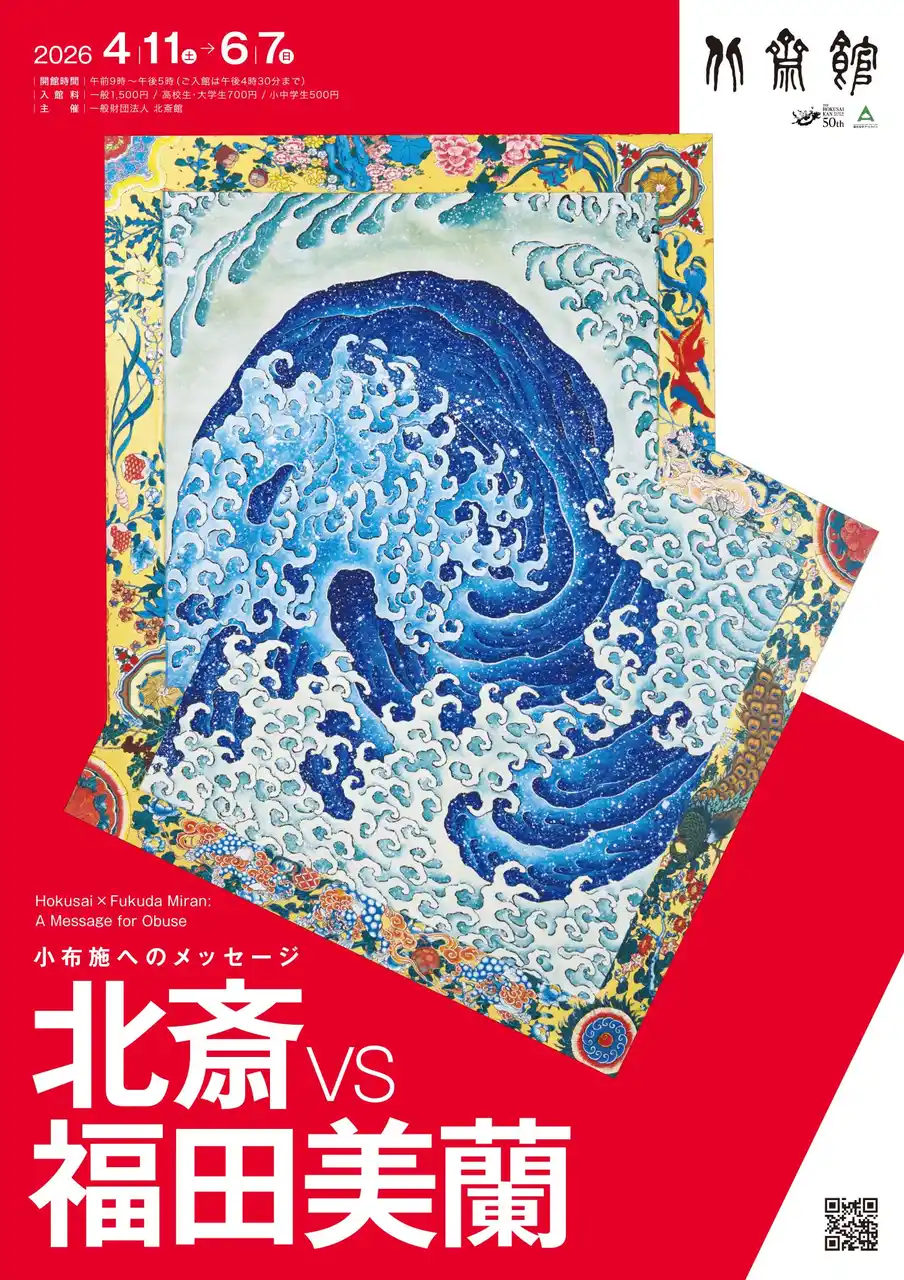 晩年の葛飾北斎が訪れて傑作を残した小布施にある、北斎館の開館50周年を記念する特別展。北斎館が所蔵する北斎の代表作「冨嶽三十六景」シリーズをはじめ、北斎が小布施町で描いた晩年の傑作「上町祭屋台天井絵 男浪・女浪」、岩松院天井絵鳳凰図などをモチーフに、現代アーティスト福田美蘭の独自の解釈と表現で生まれた、新作北斎アート作品を一挙大公開します。福田美蘭と北斎のコラボレーションで生まれた、現代人へのメッセージとしてアート作品をお楽しみいただけます。(北斎館コレクション他、新作約15点、全て初展示) |