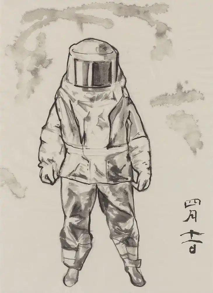 福田美蘭「日新除魔図 四月十一日 放射線防護服/柏崎刈羽原発火災事故」 |