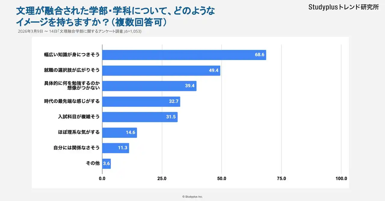 スタディプラス株式会社(本社:東京都千代田区、代表取締役:廣瀬高志、以下スタディプラス)のStudyplusトレンド研究所は、2026年3月9日(月)から3月13日(金)にかけて学習管理アプリ「Studyplus」上で全国の高校1,2生を対象に「文理融合学部に関するアンケート」を実施、1,053名から回答を得ましたのでご報告いたします。 |
