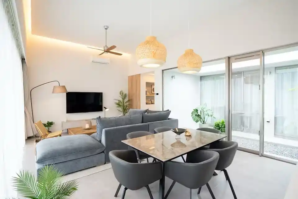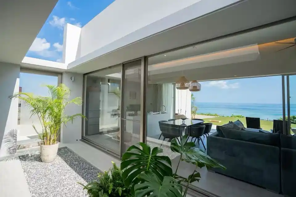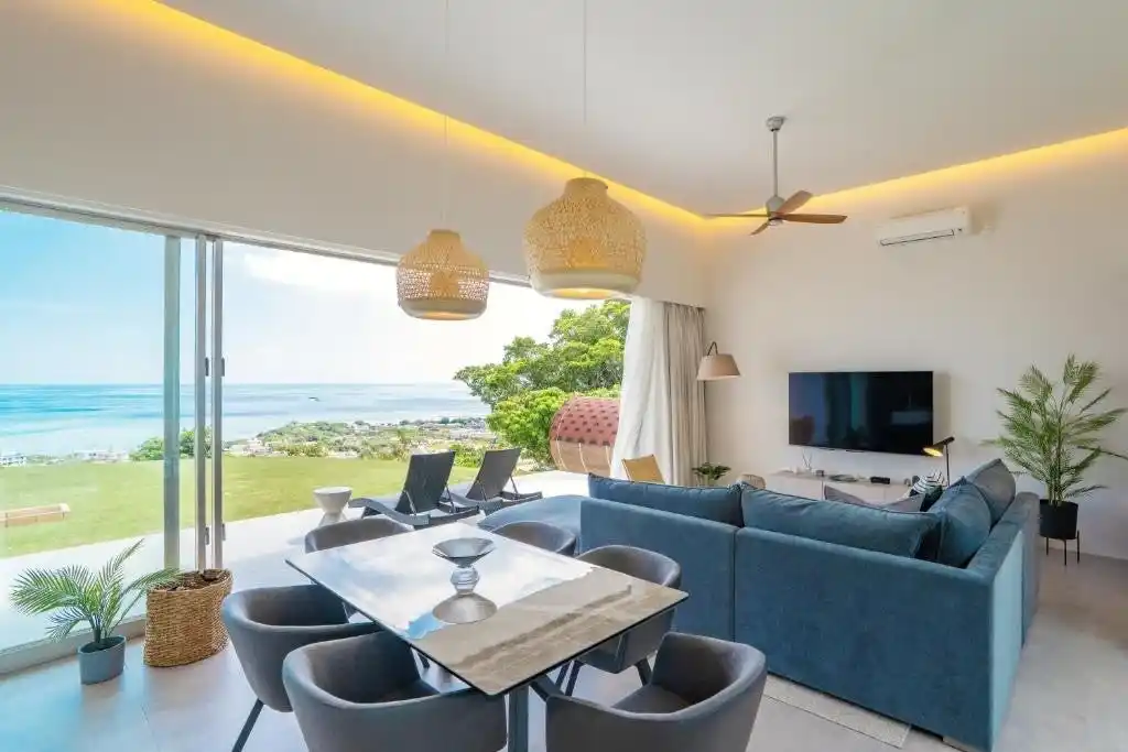 室内は、沖縄の自然素材や温もりを感じるデザインで統一され、洗練されたラグジュアリー空間が広がります。広々としたリビングや開放的なベッドルームは、大人数でもゆったりと過ごせる設計。 |