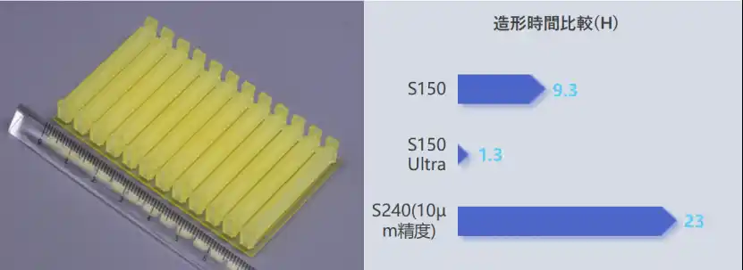 特にS150 Ultraは、S150と比較して最大約9倍、S240(10μm精度)と比較して最大約20倍の造形速度を実現し、生産性の大幅な向上に貢献します。 |
