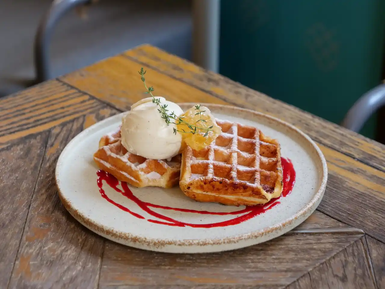 ・自家製ジェラートとコムハニームッフル ジェラートとコムハニーを合わせた、贅沢なデザートプレート。 |