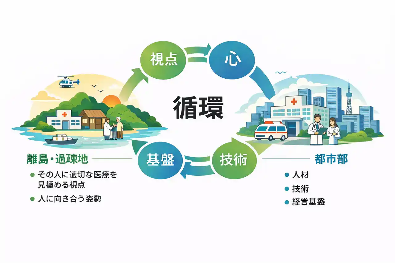 こうした循環により、都市部では一人ひとりに向き合う医療を持続可能なかたちで実現し、離島・過疎地では限られた資源の中でも適切な医療を届け続ける体制づくりにつなげ、地域医療全体の再構築を目指します。 |