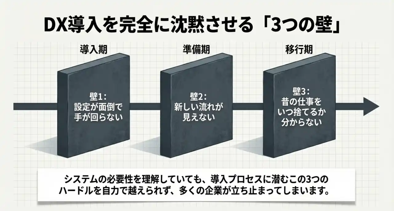 | DXONEは、導入現場で繰り返し見えてきたハードルは、主に次の3つだと考えています。 | |||||||||||||||||||||||||||