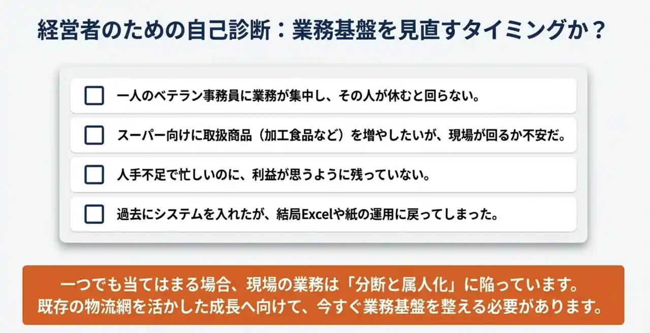 | 青果卸・食品卸の現場では、非効率であっても、そのやり方で何とか毎日を回してきた歴史があります。 | |||||||||||||||||||||||||||