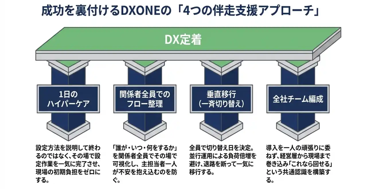 そのためDXONEは、切替えの日を関係者全員で決め、その日を境に一気に移行する「垂直的な移行方式」を基本としています。少しずつ並行運用を続けるやり方は、一見安全に見えて、実際にはどちらも中途半端になることが少なくありません。 だからこそ、準備を整えたうえで、「この日から変える」と全員で決めて移行することが重要です。 |