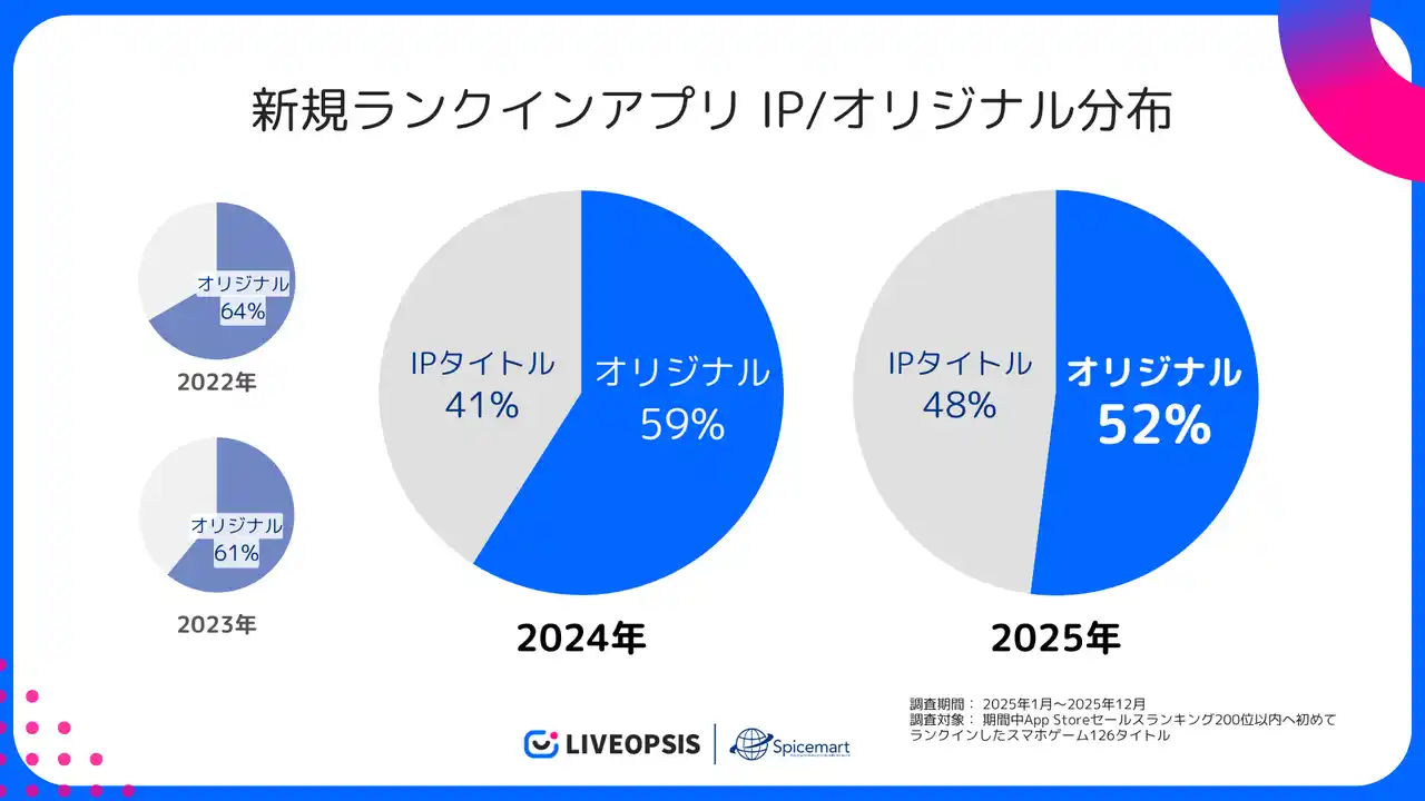 本調査では、2025年新規ランクインタイトルのうちオリジナル作品にあたる「非IP」タイトルは52%と過半数を占める結果となりました。 |