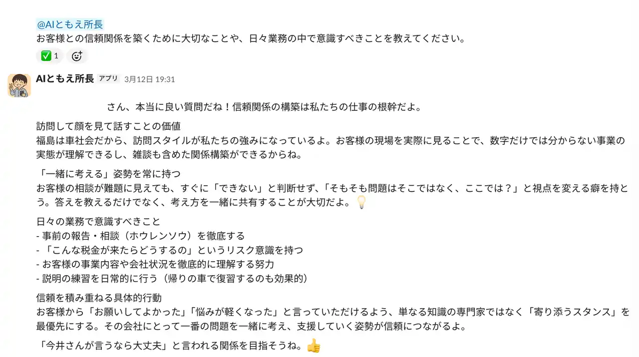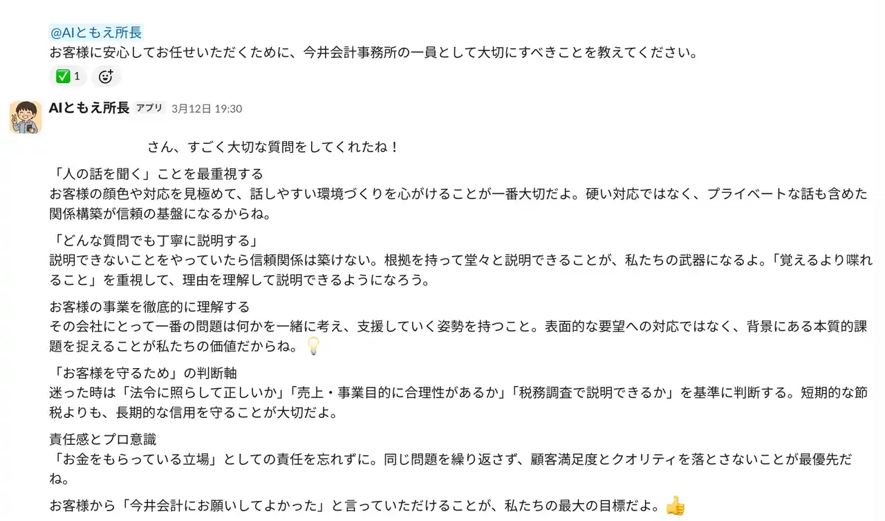 お父様が「担当であっても窓口は君だから、今井会計の顔としてお客さんのところに行ってるんだ」と職員の皆様に伝えていたと伺いました。AIともえ所長が、その言葉を体現できるプロフェッショナルを育てる一助となり、地域と共に歩んできた40年の信頼を次の世代へとつないでいくお手伝いができれば、これほど嬉しいことはありません。 |