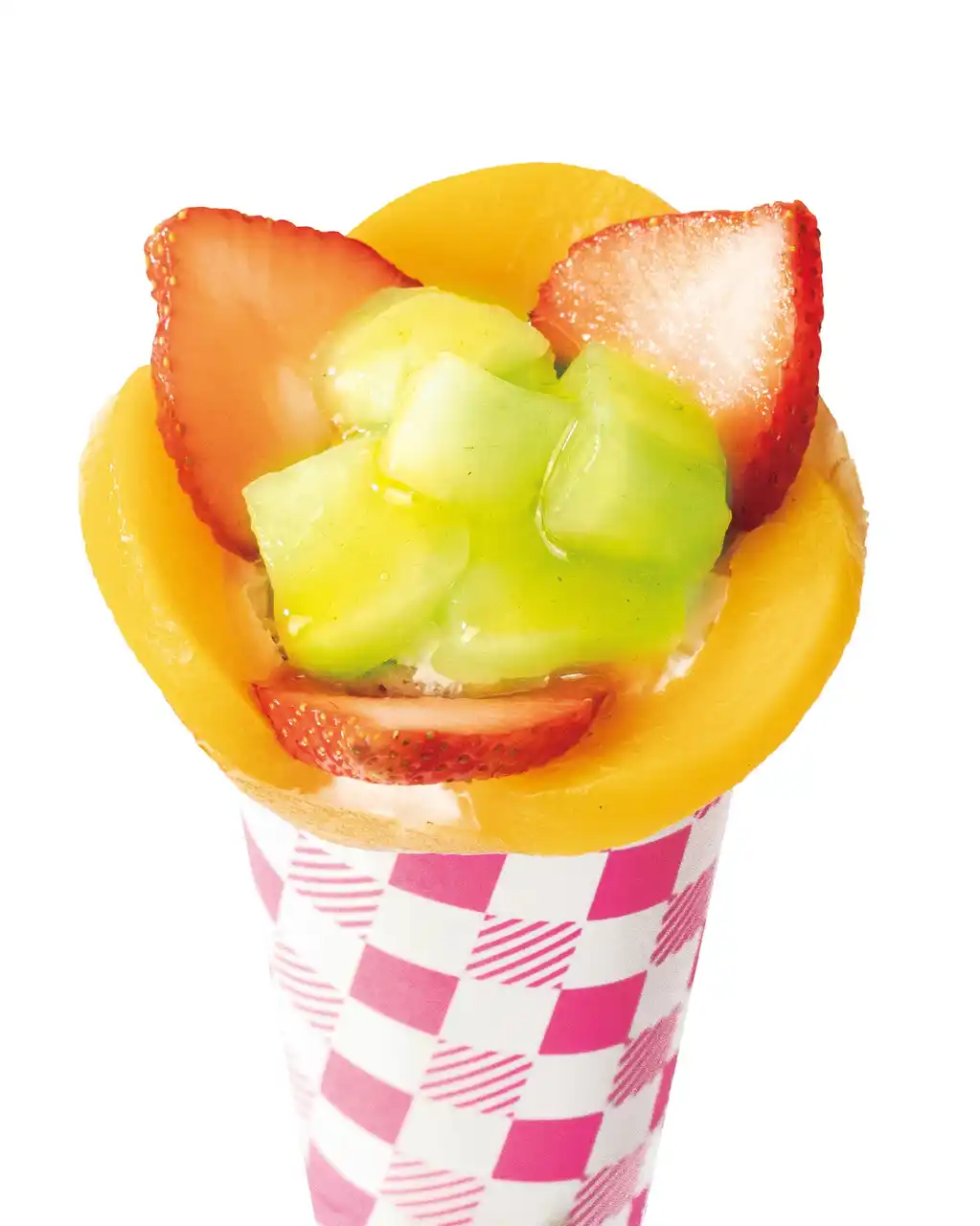 | 黄桃やメロン、苺をたっぷり盛り込み、甘いピーチソースとふんわりホイップで仕上げた、フルーツいっぱいのご褒美クレープです。ひと口ごとに様々なフルーツの味わいが楽しめる、最後まで飽きのこない一品に仕上げました。 | ||||||||||