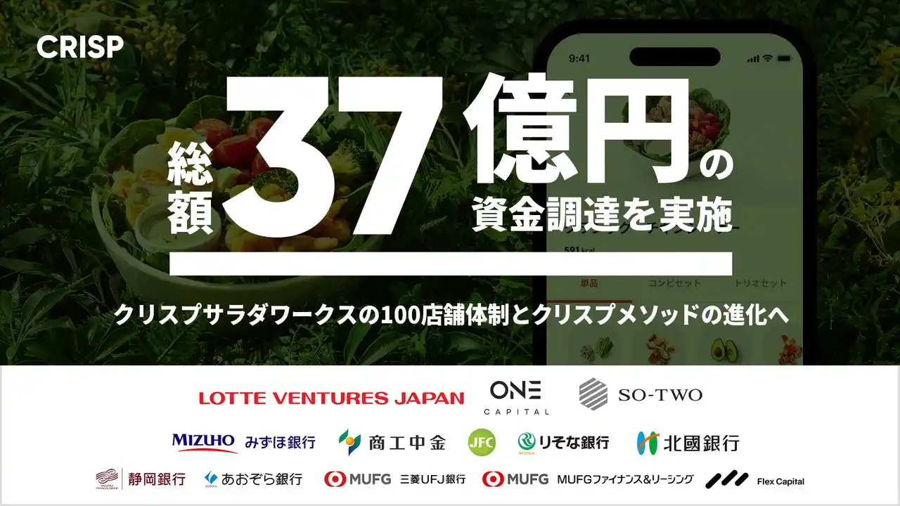 国内店舗数No.1サラダ専門店「クリスプサラダワークス」を展開する株式会社CRISP(本社:東京都港区、代表取締役:宮野 浩史、以下「CRISP」)は総額37億円の資金調達を実施しました。本ラウンドでは第三者割当増資(エクイティ)に加え、10の金融機関からの借入(デット)により、多層的な資金調達を実現しました。 |