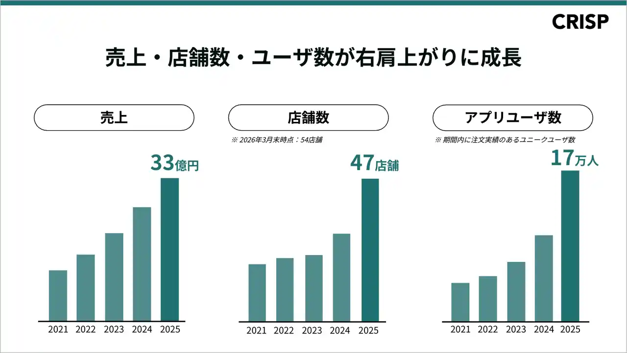 飲食業界が人手不足やコスト高騰といった大きな課題に直面する中、CRISPは「熱狂的なファンをつくる」というブレないミッションのもと、独自のデジタルプラットフォームによる徹底したDXと優れた店舗オペレーションを見事に融合させてきました。店舗数と店舗利益率の飛躍的な向上は、宮野CEO率いるチームが築き上げた「クリスプメソッド」の強固な収益力を証明するものです。 |