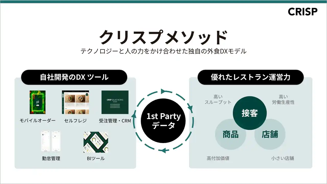 CRISP様の徹底したデータドリブン経営やDXノウハウ、顧客体験創造力がマーケットで圧倒的な競争力と加速度的な成長を実現されています。 |