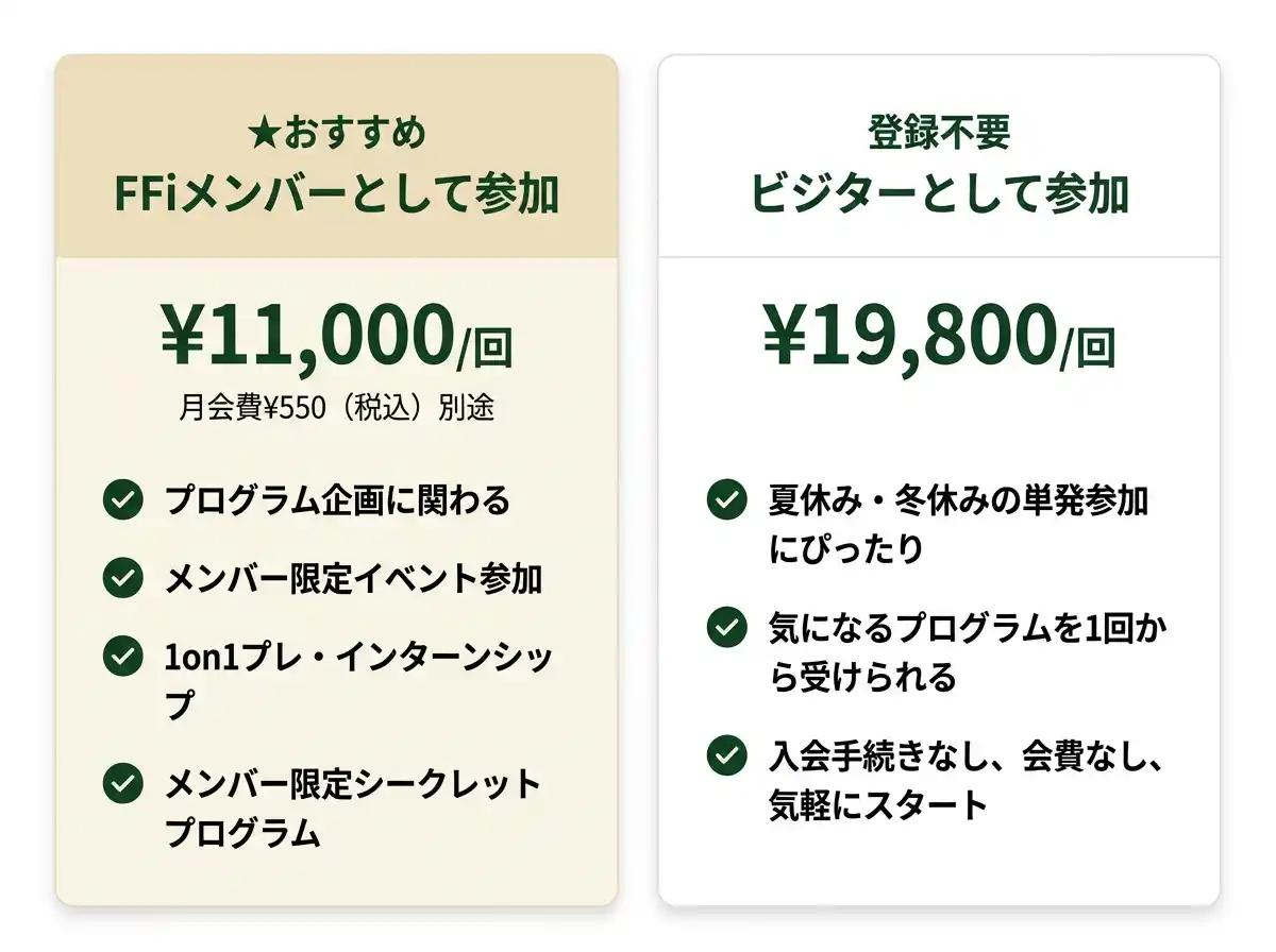 ※ メンバーの参加費:¥11,000/回(税込)+ 月会費¥550(税込)別途 / ビジターの参加費:¥19,800/回(税込)月会費なし ※ ビジターの方は初回のみ簡単なフォーム記入があります。 ※ メンバーは高校3年生の3月末で自動退会となります。 |