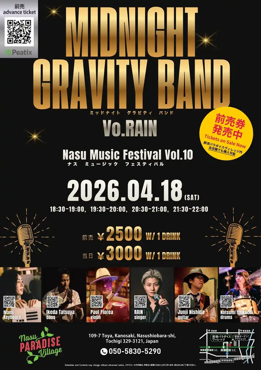 冬が終わり、春の気配漂う那須の夜を彩る音楽の祭典。記念すべき第10回目となる「Nasu Music Festival」 今回は6名編成のフルバンド「MIDNIGHT GRAVITY BAND Vo.RAIN」を迎え、一夜限りの豪華なステージをお届けします。 |