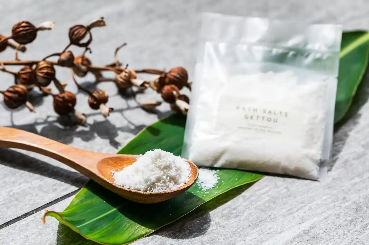 お帰りの際には、沖縄県産の海塩と月桃を使用したホテルオリジナルのバスソルトをお渡しします。客室でのバスタイムに取り入れることで、スパでの上半身ケアの余韻をそのままに、湯船でくつろぎながら、下半身まで心地よく温めていただけます。足裏をやさしくほぐしたり、足首から膝に向かってふくらはぎをなでるようにケアすることで、すっきりとした軽やかさへと導きます。 |