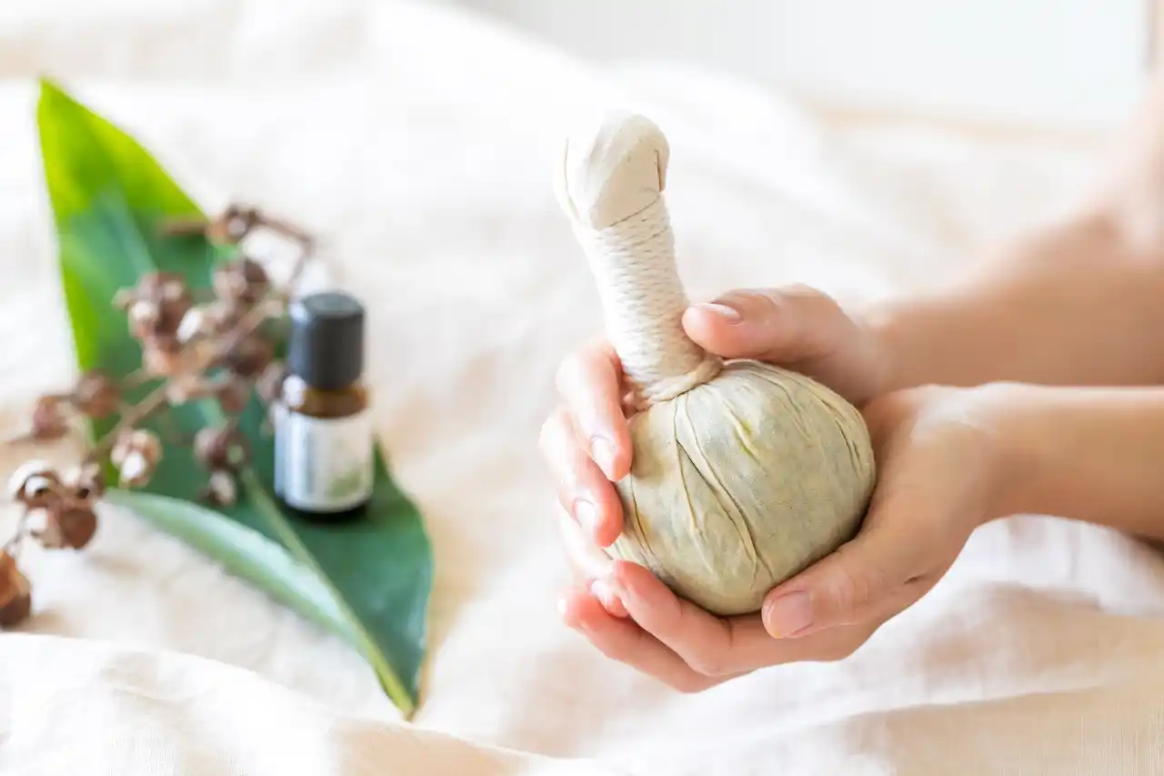トリートメントでは、月桃をはじめ約20種類のハーブを包んだ「ミニハーブボール」を使用。沖縄で古くから親しまれてきた月桃は、葉を蒸したときに立ちのぼる清々しい香りが魅力。温めたハーブボールがデコルテ・背中・上肢をやさしくほぐし、じんわりとした温もりが全身をやわらかく包み込むことで、日頃の緊張や疲れをやわらげます。 |