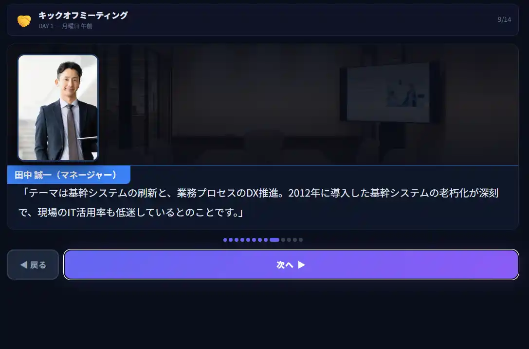 主人公は基幹システムの刷新と業務プロセスのDX推進PJに参画。 チーム発足から初回の役員報告までの1週間を体験するプログラムです。 |
