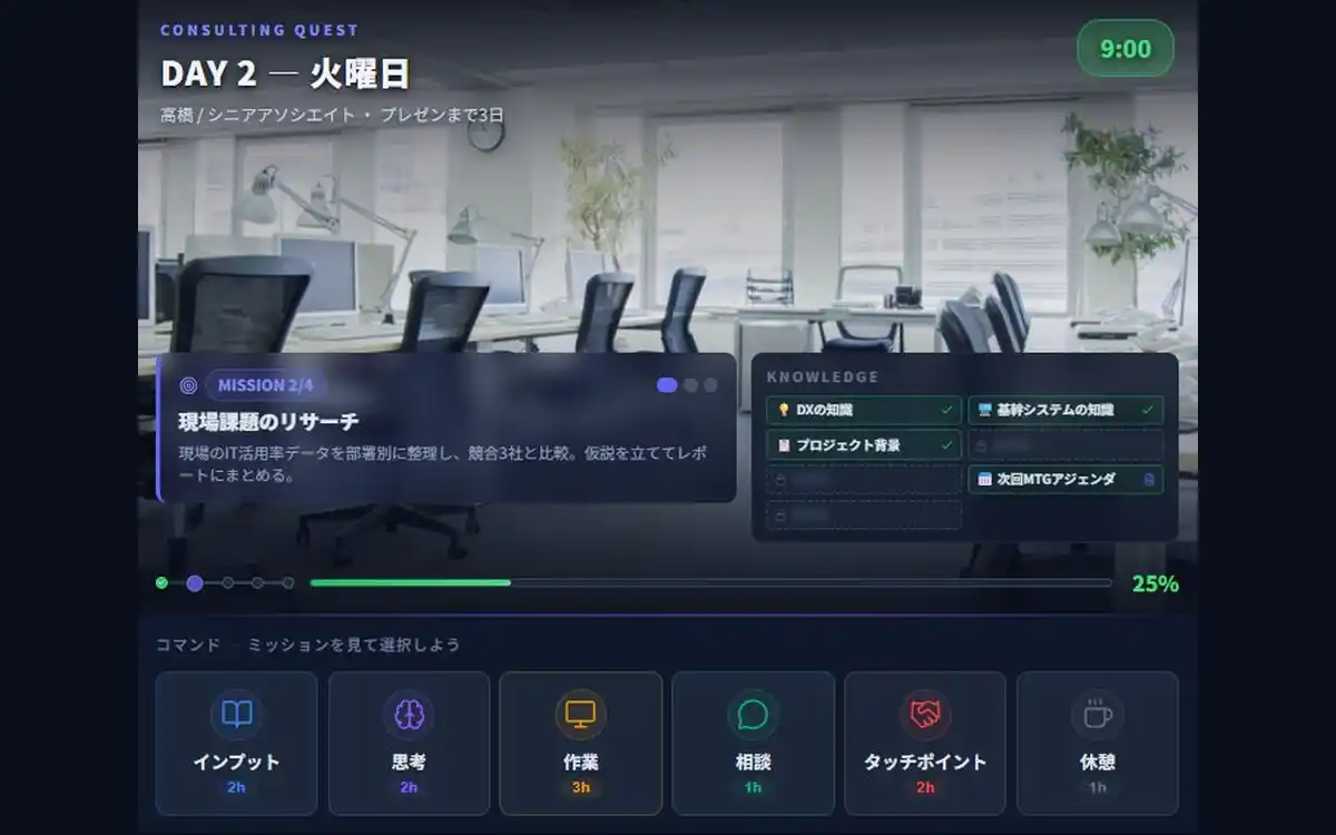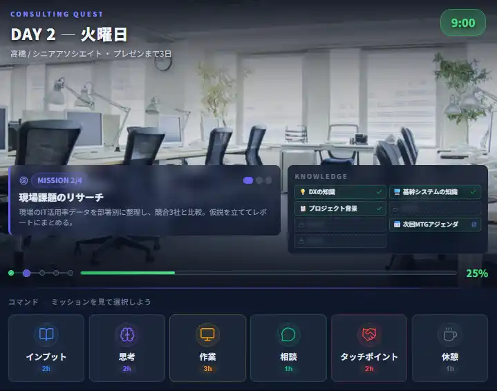 ミッションの達成に向けて「インプット」「思考」「作業」「相談」などのコマンドを選択しながらプロジェクトを進めます。 1日の業務時間は限られており、情報収集、仮説の整理、スライド作成、マネージャーへの報告--すべてをこなすには時間が足りません。 「今この1時間で何をすべきか」を常に考え続ける、コンサルティング業務の忙しさと判断の連続をリアルに体験できます。 |