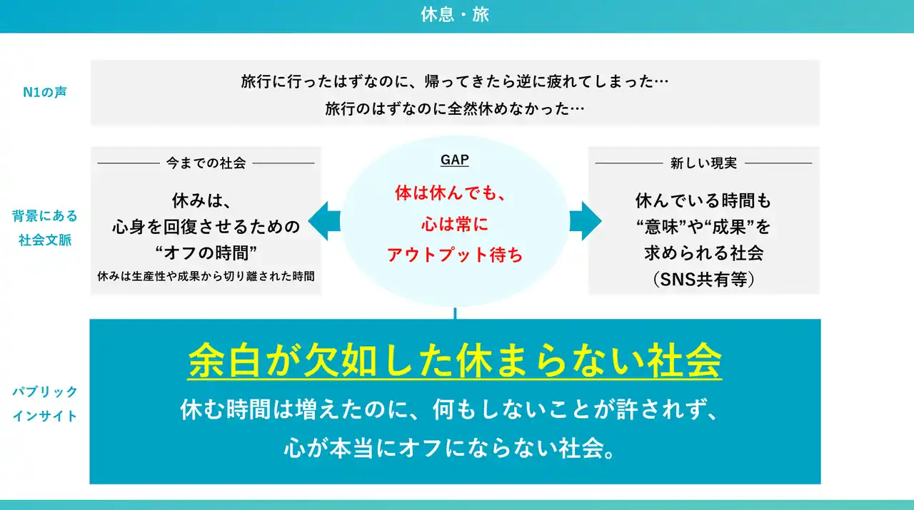 上記のパブリックインサイトを言語化することで、「何もしないこと」を全面的に肯定するブランドメッセージの発信や、デジタルから離れて心からオフになるリトリートプランの企画など、中長期的な事業テーマと具体的な打ち手の創出へと繋げます。 |