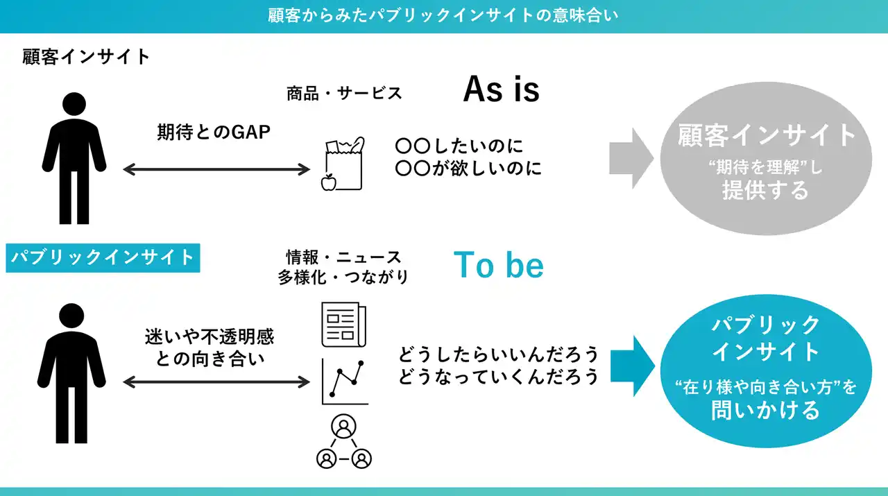 これまでの顧客インサイトが「商品・サービスへの期待」であり、これを理解して期待に応える商品・サービスを提供することで瞬間的な効果を生むものだとすれば、パブリックインサイトは「社会全体のモヤモヤを言語化し共感をもたらす」ものです。 |