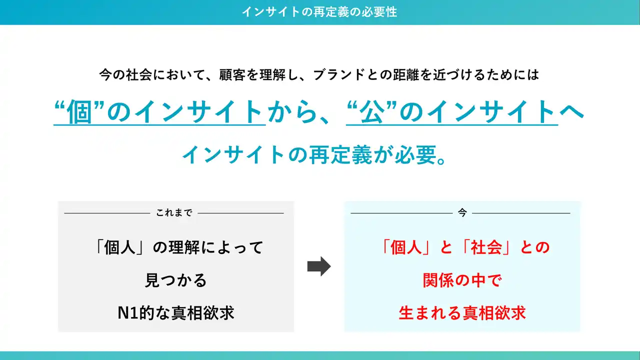 こうした「個」と「企業」が抱える共通の課題を解決するため、インサイトの再定義が必要と考えました。そこで、個人の声を社会全体の文脈で捉え直し、未来の価値をデザインする新フレームワーク「パブリックインサイト」の共同開発に至りました。 |