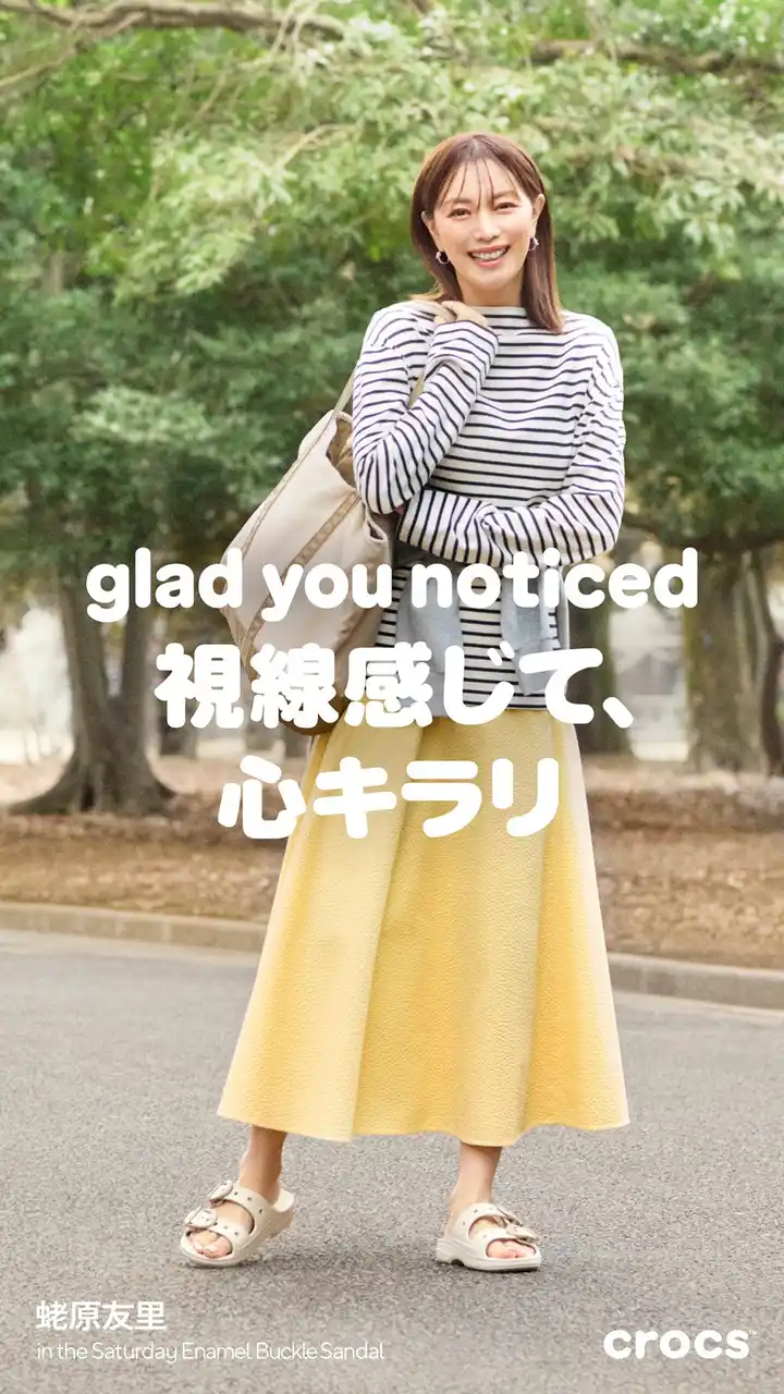 今回の「おとなクロックス」キャンペーンでは、大人の日常を切り取った2つのシーンを通じて、シンプルで洗練されたデザインと快適な履き心地を提案します。公園からオフィスまで、思わず「おとなクロックス、ありかも」と感じるスタイルをご紹介します。公園のビジュアルではボーダーのカットソーに春らしいイエローのスカートを纏った蛯原さんが登場。子どもと過ごす休日はたくさん動き回れるように「サタデー エナメル バックル サンダル」を合わせ、心地よく過ごせるスタイルを提案します。アクティブに動くシーンからリラックスしたピクニックのひとときまで、休日に寄り添う足元に注目です。 |