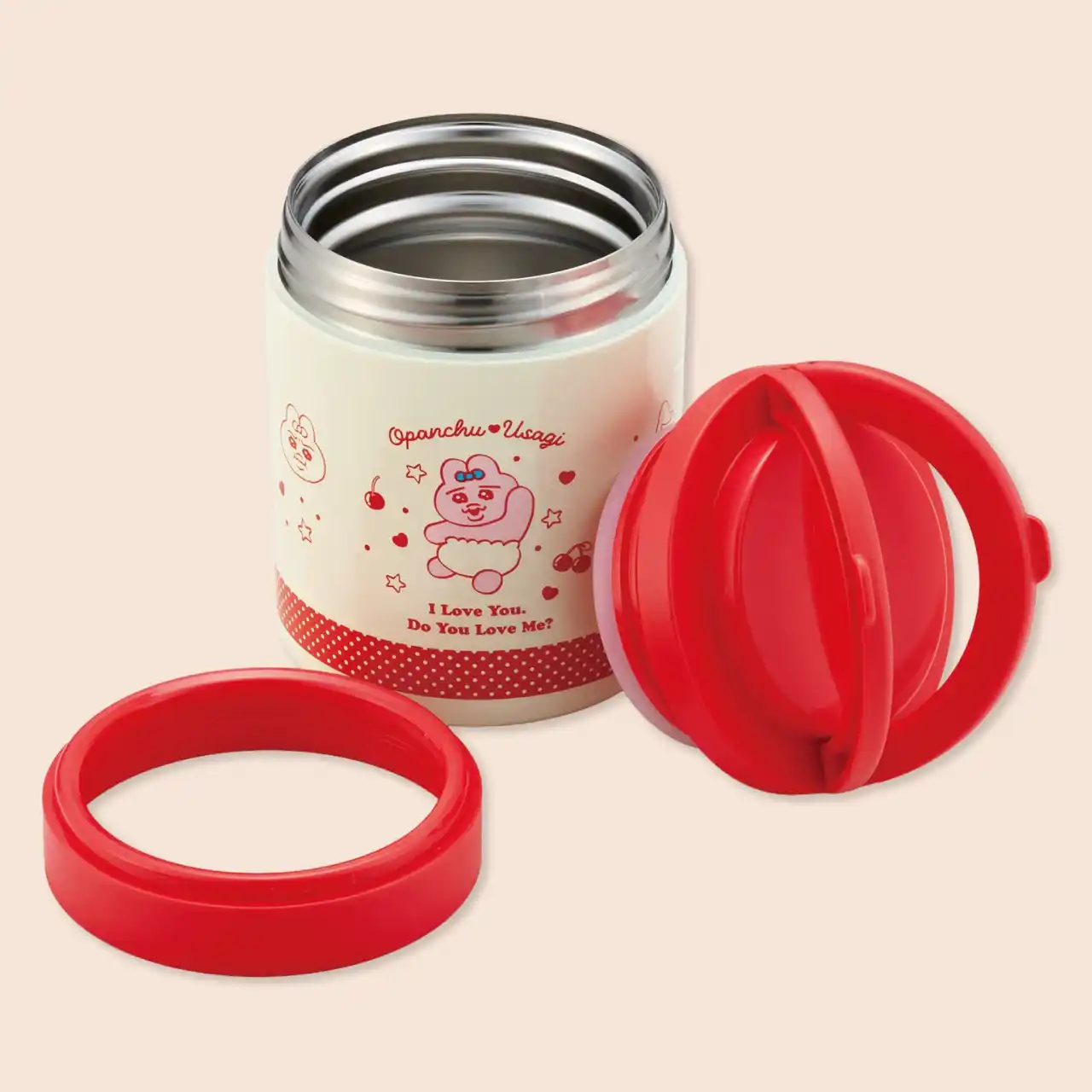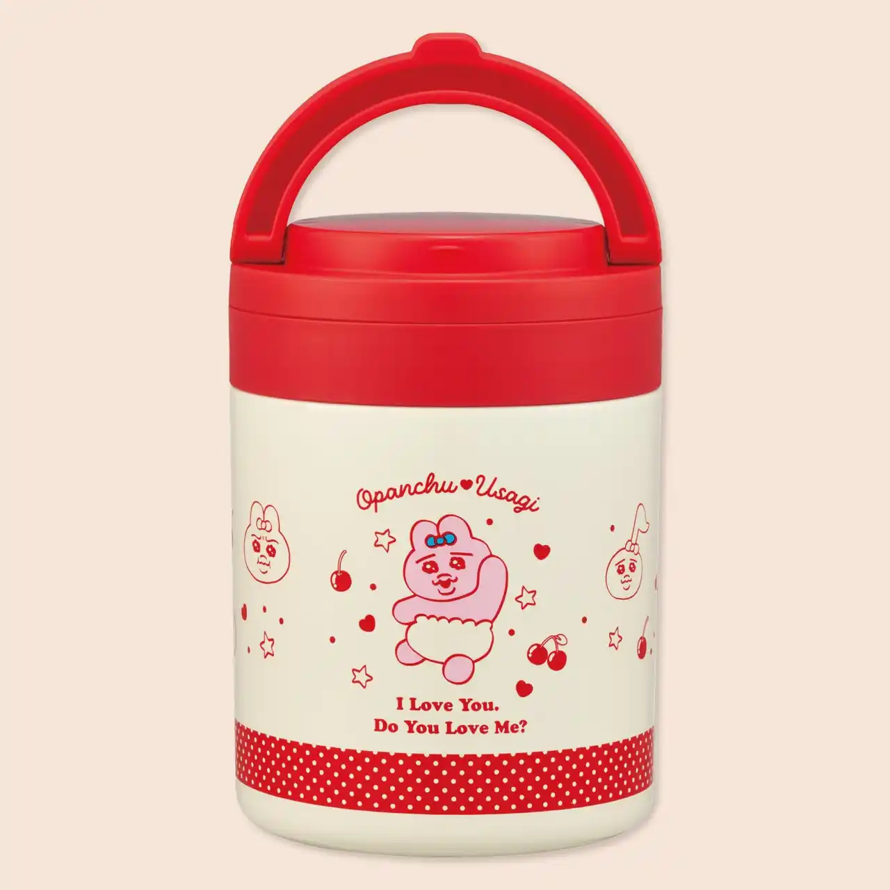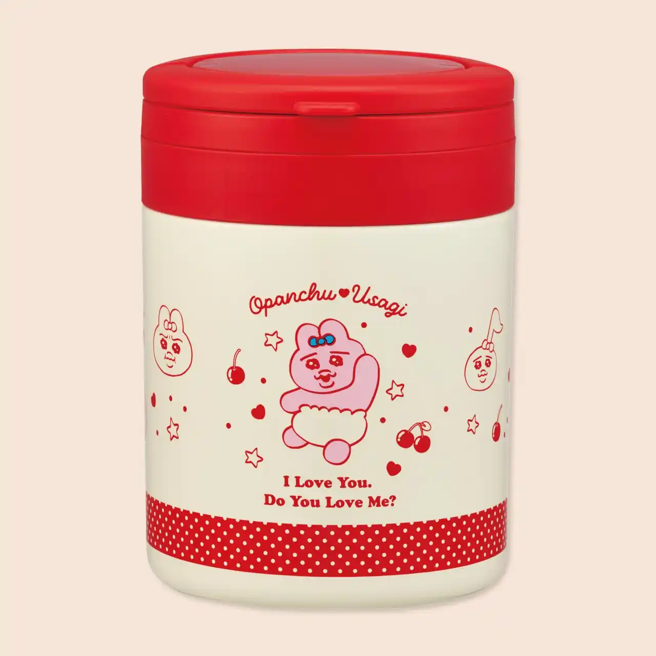 アイボリーと赤を基調に、サクランボや「おぱんちゅうさぎ」のイラストをあしらった、レトロでポップなデザインがランチタイムを明るく彩ります。 |