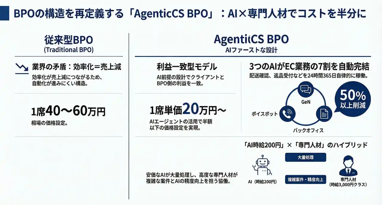 ■ AgenticCS BPOの仕組み:「AIの時給200円」と「人の時給3,000円」の協働 |