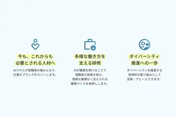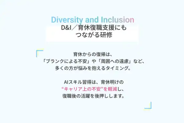 ・育休・産休から復職する社員が、仕事のブランクをAIスキルで補い、スムーズにパフォーマンスを発揮できる環境づくりに ・AIが業務負担を軽減することで、多様な働き方(時短・在宅・フレックス)でも戦力として活躍できる職場環境の整備に ・デジタルスキルによる女性活躍推進施策、ダイバーシティ&インクルージョンの具体策として |