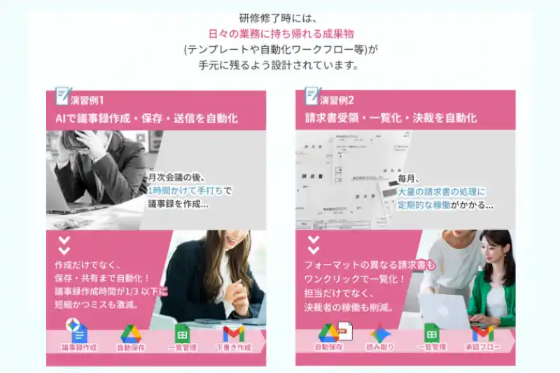 <演習例(一部)> ・ AIで議事録作成・保存・送信を自動化 → 議事録作成時間を大幅に短縮、ミスも減少 ・ 請求書受領・一覧化・決裁を自動化 → フォーマットが異なる請求書もワンクリックで一覧化 ・ 報告書・メール文章のAI作成 → AIが下書きし、担当者が修正するだけの業務フローへ ・ 手書き伝票・顧客情報のデータ化 → AI画像分析を活用した自動データ化 ※その他、企画・営業・マーケティング・経理・人事・事務等、様々な業務に対応 |