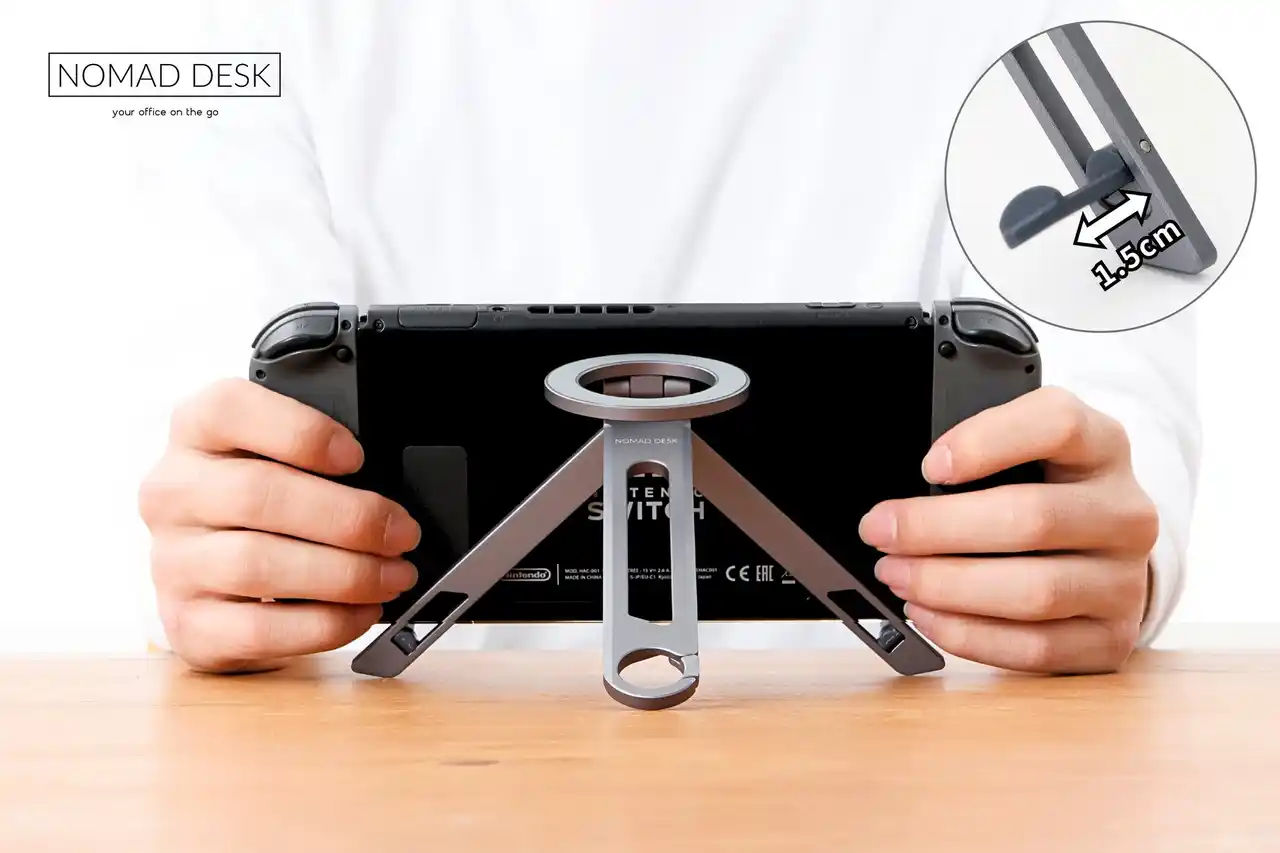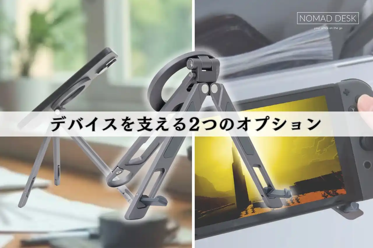 本体に備えたクレードルを広げることで、スマートフォンだけでなくタブレットや携帯ゲーム機にも対応。動画視聴やゲームプレイなど、用途に応じてデバイスを置いて使える柔軟性を備えており、1台で複数のシーンに対応できる設計です。 |