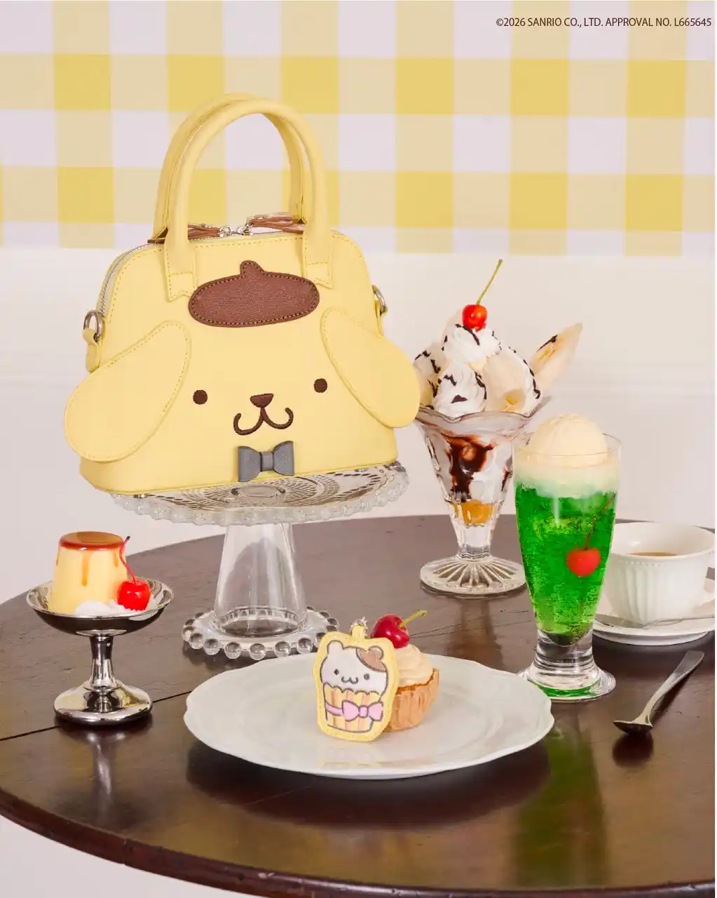 ポムポムプリンのお顔がそのままデザインされたショルダーバッグは、 カフェをイメージしたオリジナルデザインと同じ蝶ネクタイ付き。 |