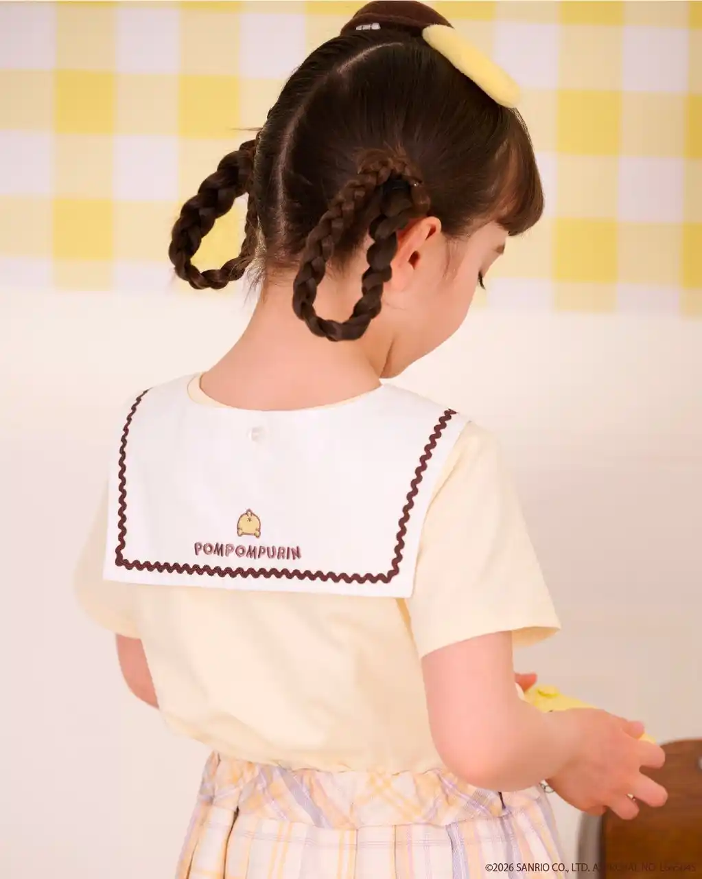 セーラーの後衿のポムポムプリンのお尻の刺繍がポイントのTシャツと、ポーチ付きのスカパンを合わせれば憧れの制服風コーディネートの完成。 |