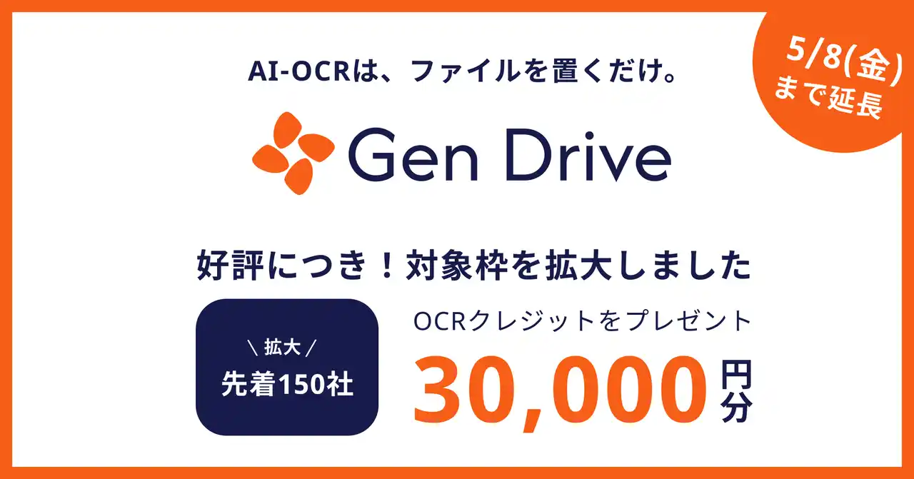Gen Driveのリニューアルを記念して実施中のOCRクレジット3万円分プレゼントキャンペーンは、当初の先着100社に開始からわずか4営業日で到達いたしました。多くのお申し込みをいただいたことに感謝し、対象枠を先着150社に拡大するとともに、キャンペーン期間も2026年5月8日(金)まで延長いたします。 |