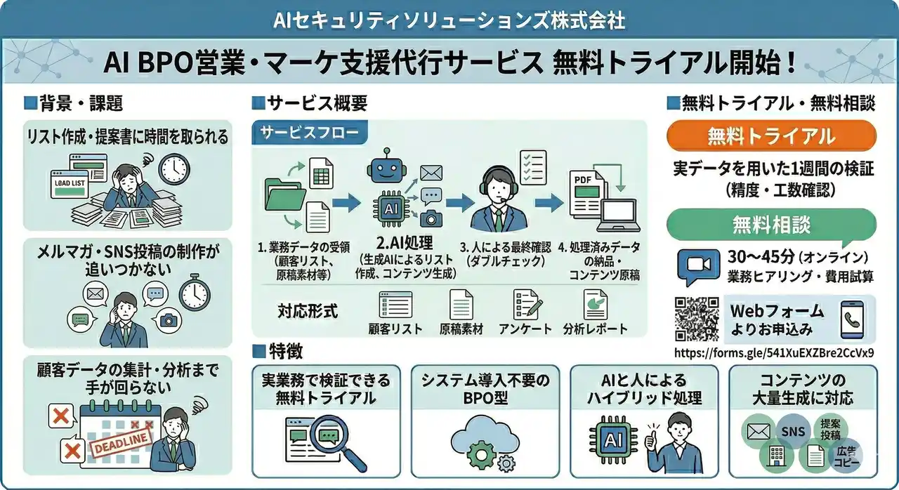 AIセキュリティソリューションズ株式会社(本社:東京都、以下当社)は、営業・マーケティング部門の実務を支援する「AI BPO営業・マーケ支援代行サービス」について、本日より無料トライアルおよび無料相談の提供を開始しました。 |