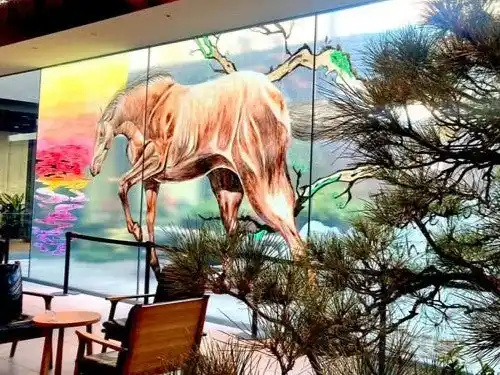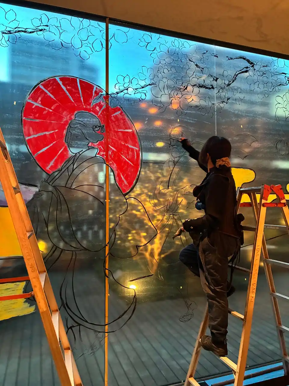 東京ベイ潮見プリンスホテルのエントランスロビーの窓に描かれた江戸の春をイメージした『爛漫-Ranman-』 |